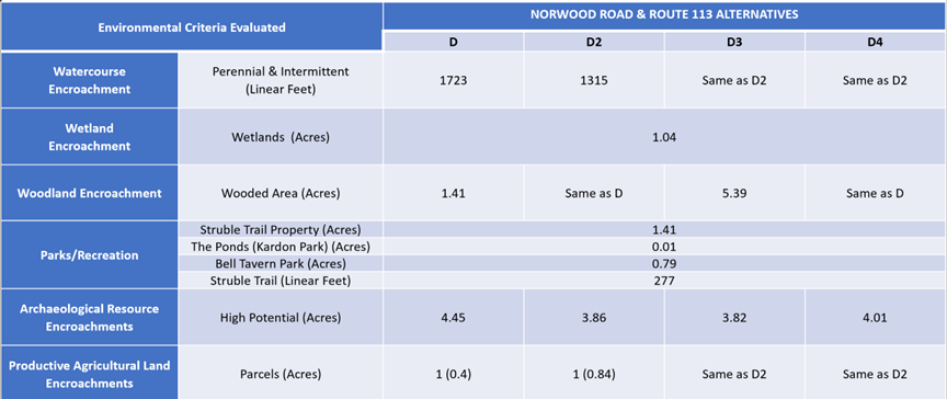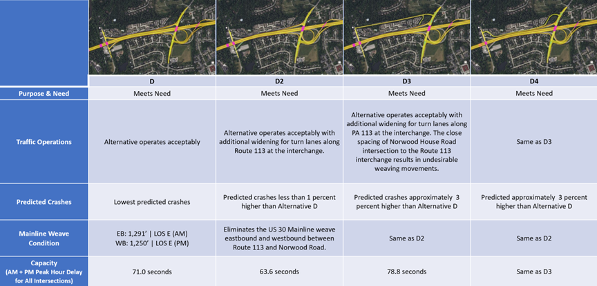 - Norwood House Road remains in the existing configuration. Traffic calming will be installed to discourage its use as a direct connection between Norwood Road and PA 113. Norwood Road traffic will utilize Garris Road to the north or Route 282 and Pennsylvania Avenue to the south to access the new Route 113 full interchange.