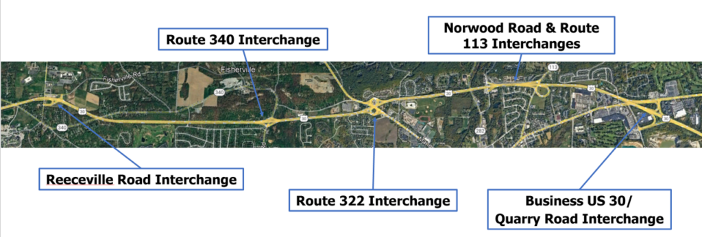 The Pennsylvania Department of Transportation (PennDOT) invites the public to attend a live virtual public meeting and an in-person open house plans display for the U.S. 30 Eastern Project Area (Section CER). The project team will present the selected alternatives for U.S. 30 mainline and the Reeceville Road, Route 340, and Route 322 interchanges, and the revised alternatives for the Norwood Road and Route 113 interchanges.
